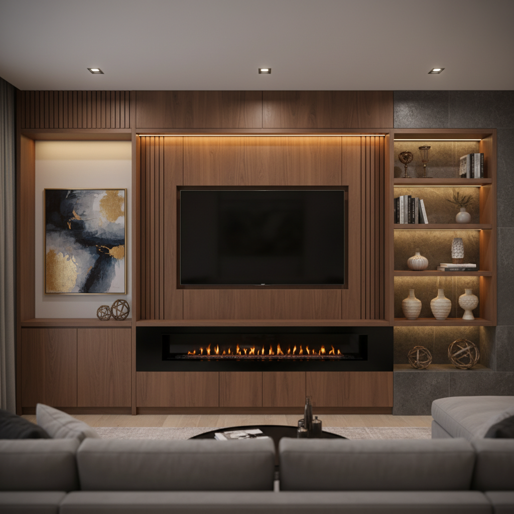 Media walls with electric fireplaces and integrated artwork are a major trend, blending warmth, style, and technology. We can design your wall to:
